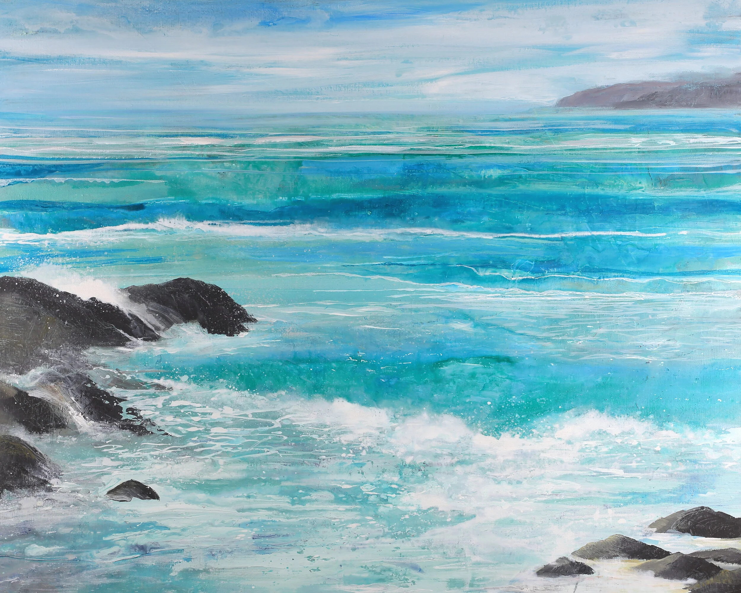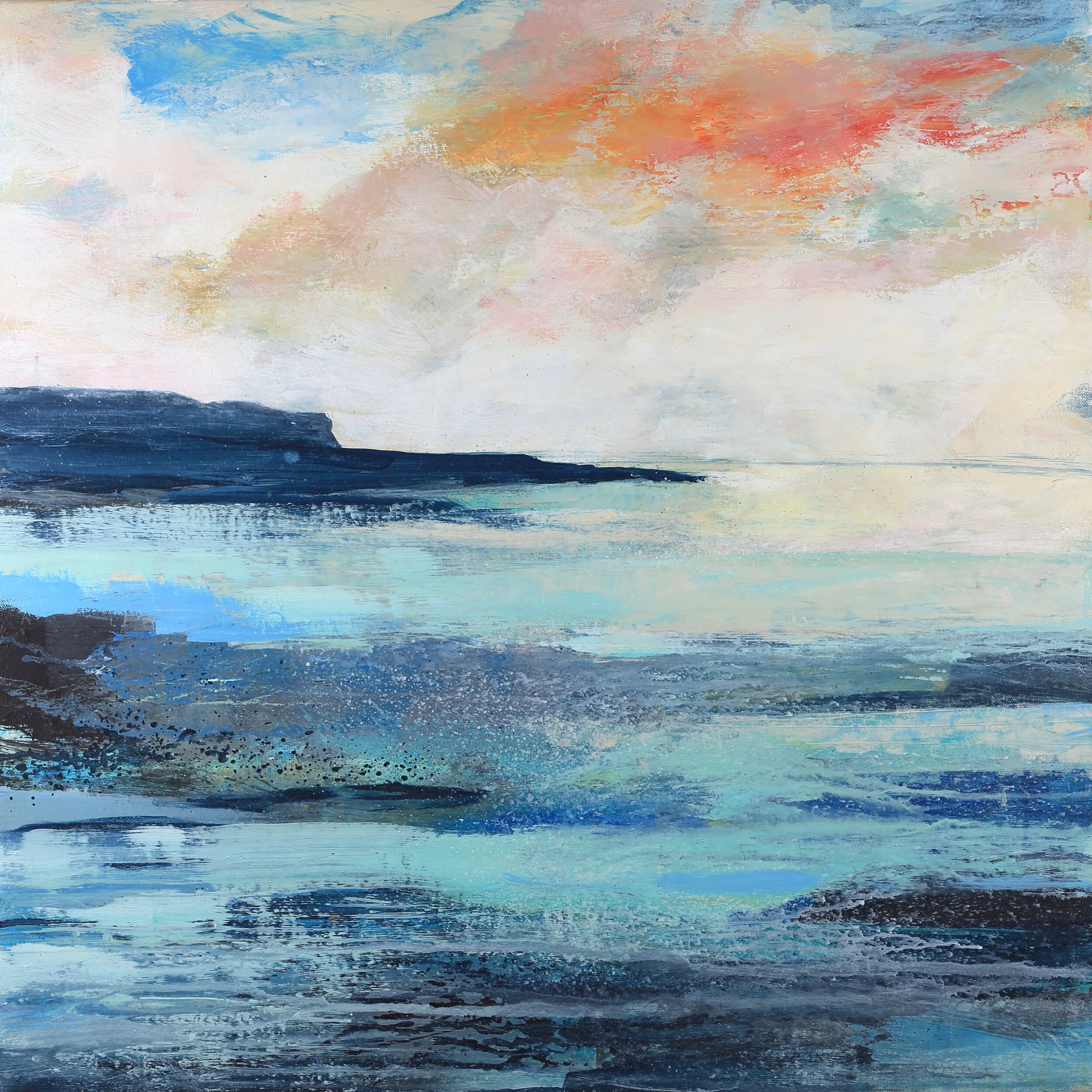One of my favourite things to do is walk by the sea and you will have noticed how the colour of the water varies significantly depending on location and weather. For example, the muted greys and greens of the North Sea in winter compared to the aqua blue tropical shades of the Indian Ocean. I am drawn to the subject because I love capturing LIGHT but rather than reproduce exactly what I see I try to capture and express the feeling of phsyically being there; the waves crashing on the beach, the time of day, light, warmth from the sun and the natural habitat. I have been known to complete canvases directly en plain air but I have to admit that its best to choose your spot wisely - so much sand ended up in the paints I didn’t need to worry about adding texture. The experience was fantastic though and I definitely advise you to give it a try!