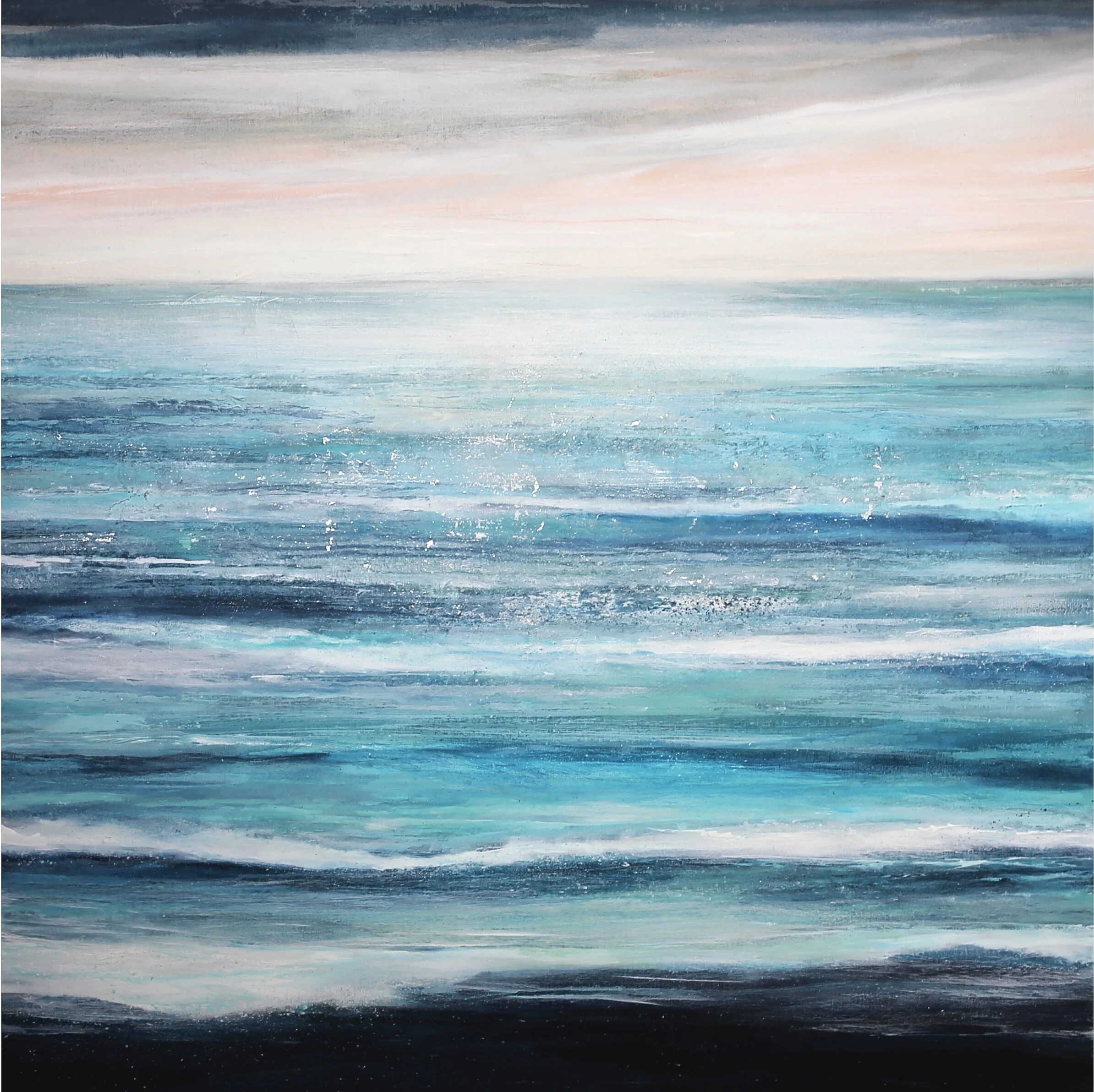 INTO THE LIGHT. 100 x 100 x 4 cm. I could spend (and probably have spent) hours just trying to capture the roll of a wave and the colour of the water as the waves gently lap on the sand. Here I settled for expressing the sheer expanse of water with titanium white and silver foil collaged to indicate the light as it bounces across the waves.