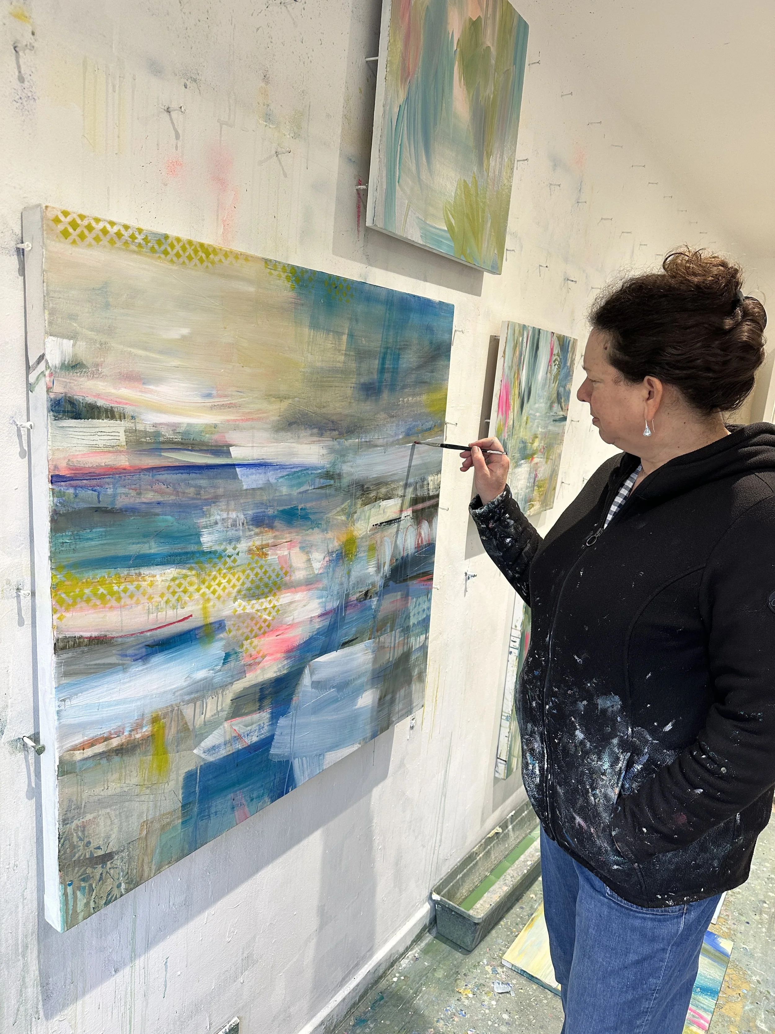January is studio month exploring new landscapes, chasing colour and depth. What a great way to start the year! Each palette awakens memories — growing up as a Northern lass, wandering the Yorkshire Dales, school trips from Harrogate that felt like the highlight of the term, visits to York Minster and walks across The Stray. Now, living down South, the Cotswolds and the Somerset countryside inspire my work.